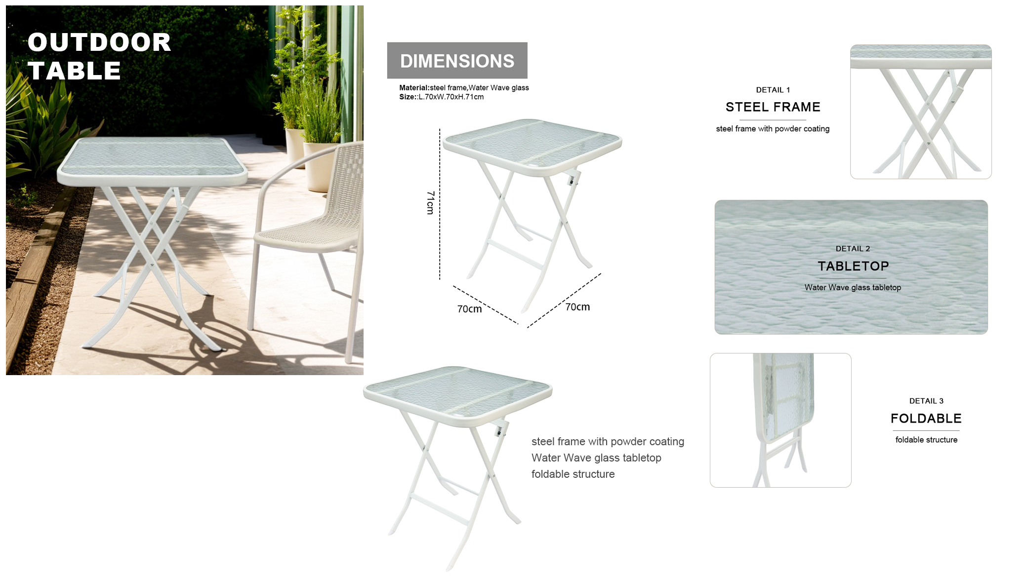 Outdoor Folding Patio Side Table Garden Table with Water Wave Glass Metal Steel Iron Dining Outdoor Table for Garden