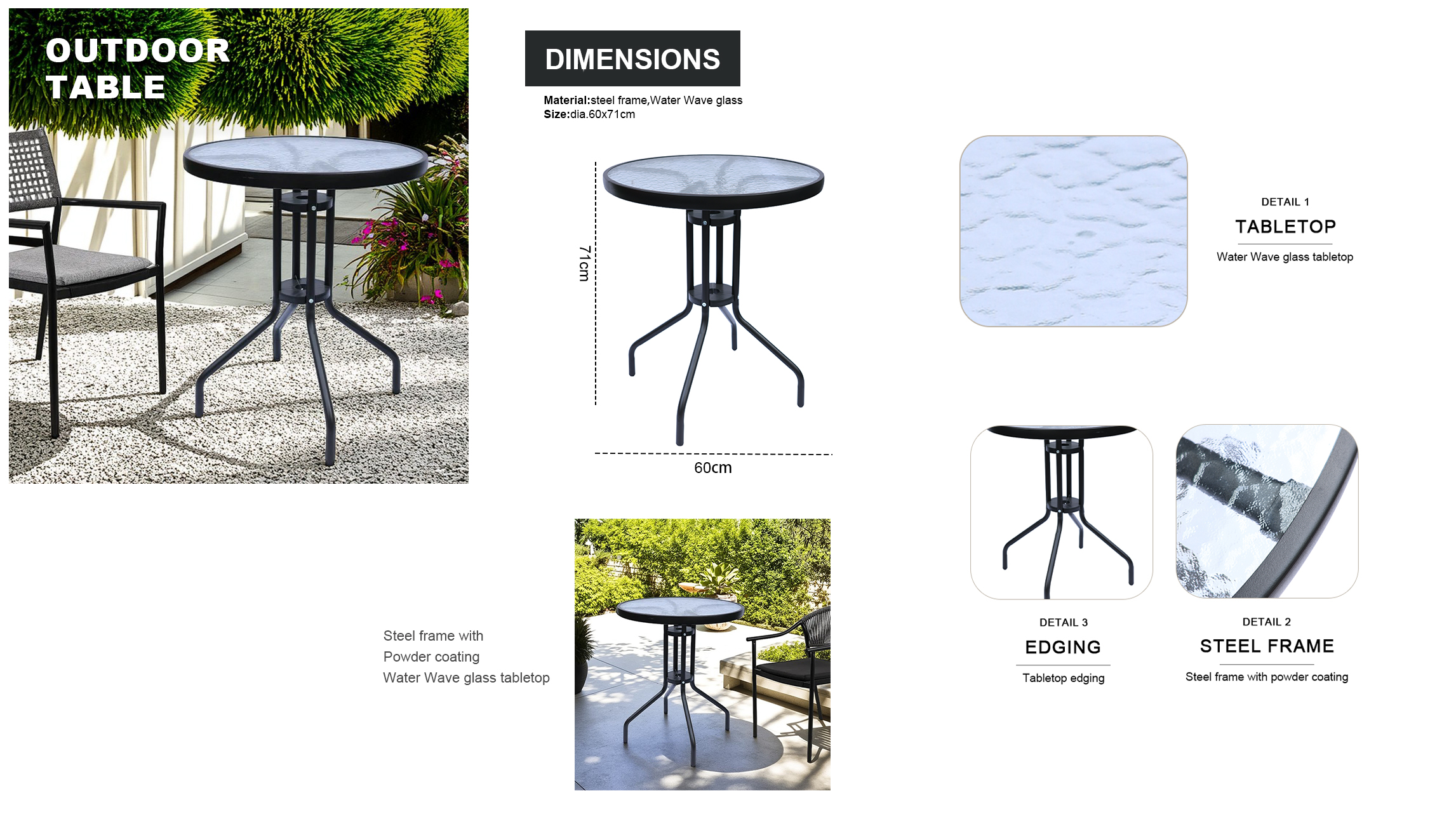 Outdoor Folding Patio Side Table Garden Round Table with Water Wave Glass Metal Steel Iron Dining Outdoor Table for Garden