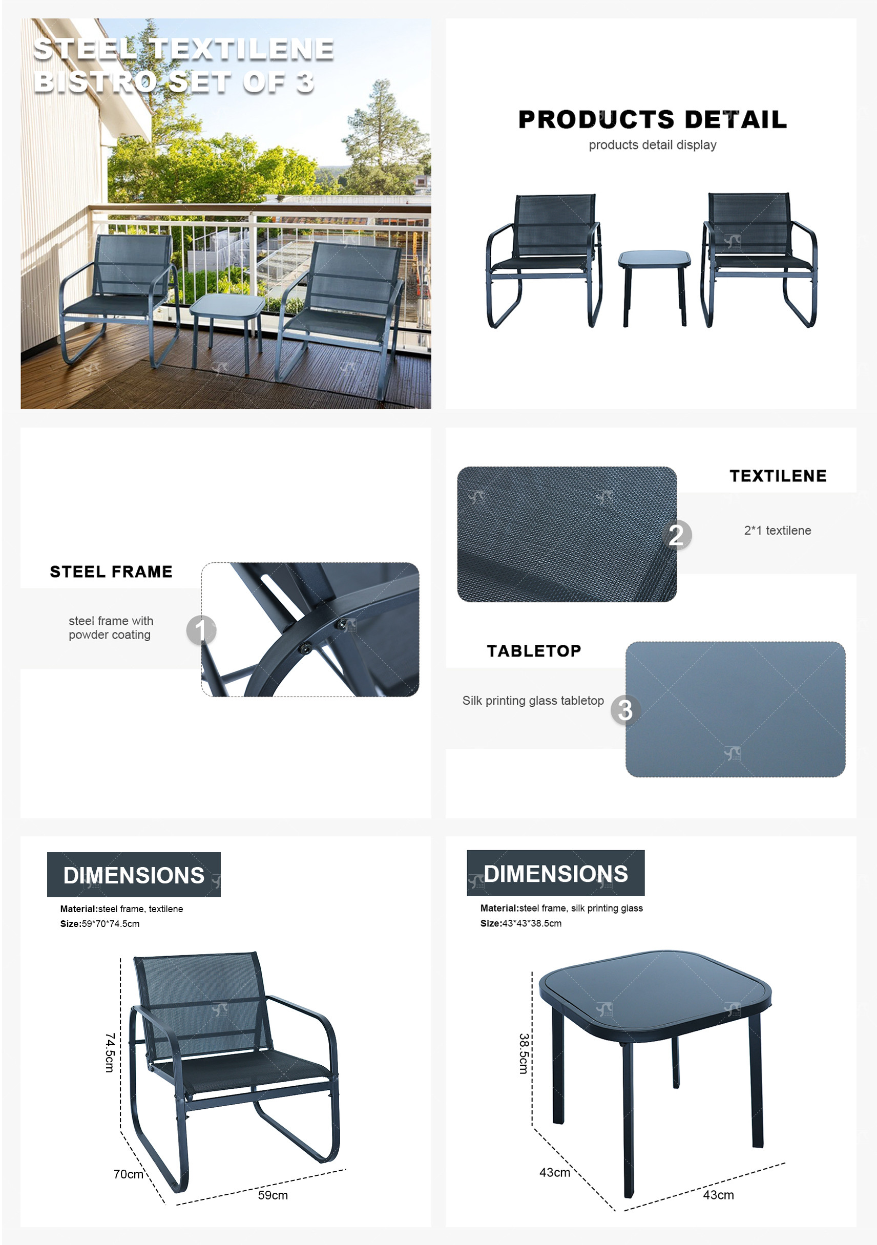 Outdoor Coffee Sets Silk Printing Glass Table and Chair Camping Patio Dinning Steel Garden Chair Three-piece Sets
