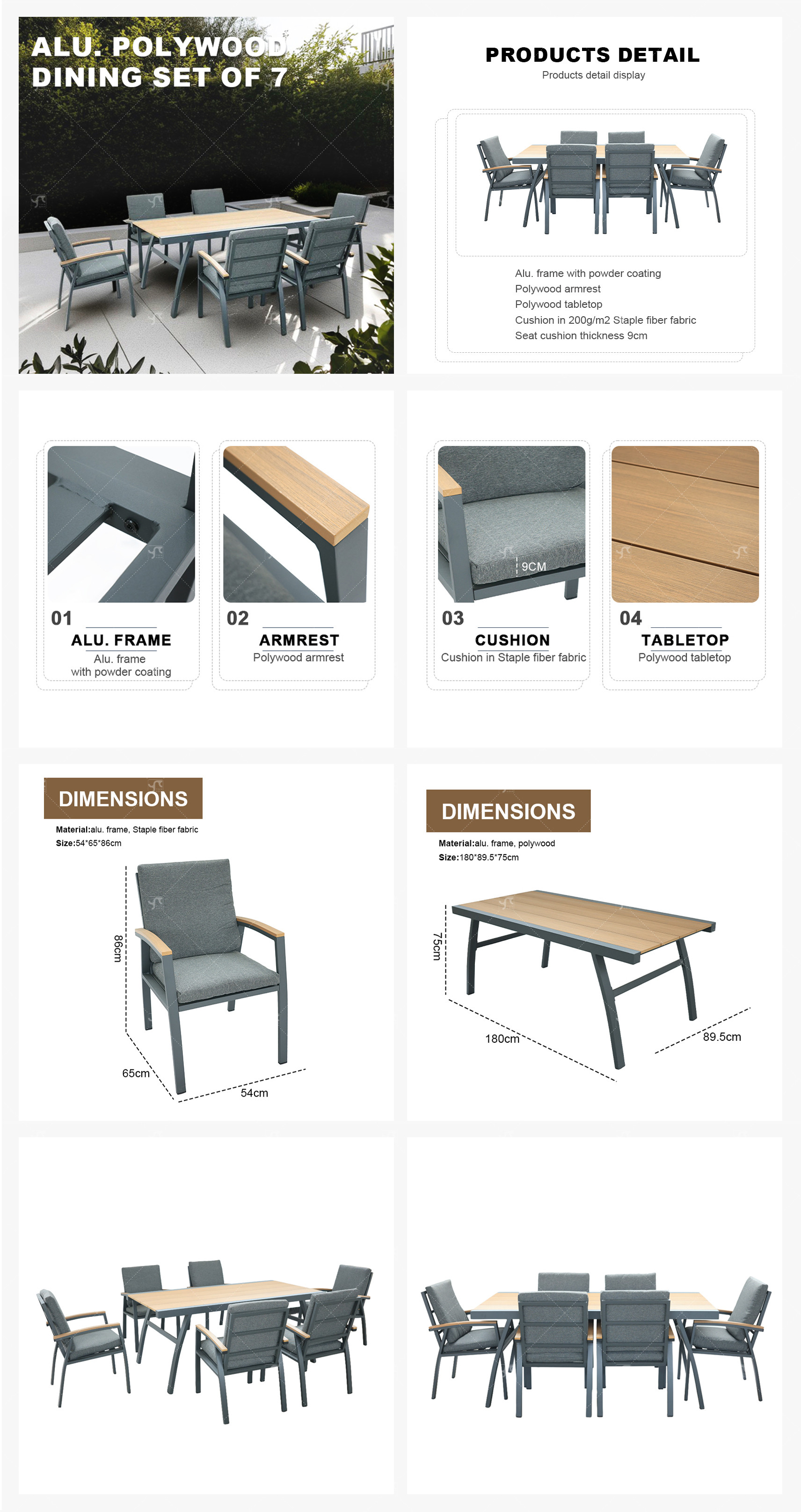 Outdoor Modern Hot Selling Good Quality Garden Furniture Dining Set of 7 Alu. Frame Dining Set of 7