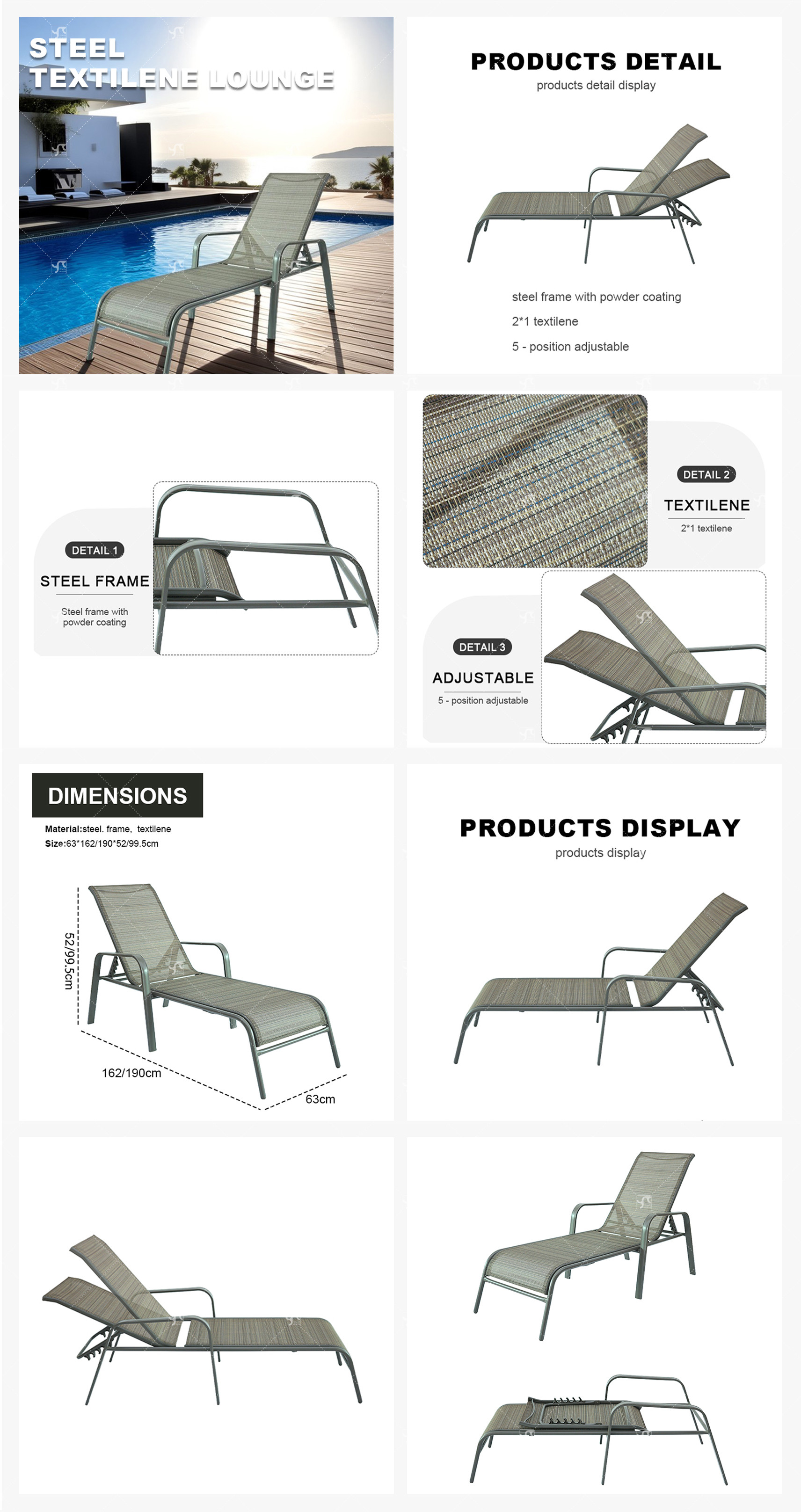 Outdoor Steel Five Position Adjustable Garden Beach Chaise Lounge Chair Patio Garden Hotel Sun Lounge