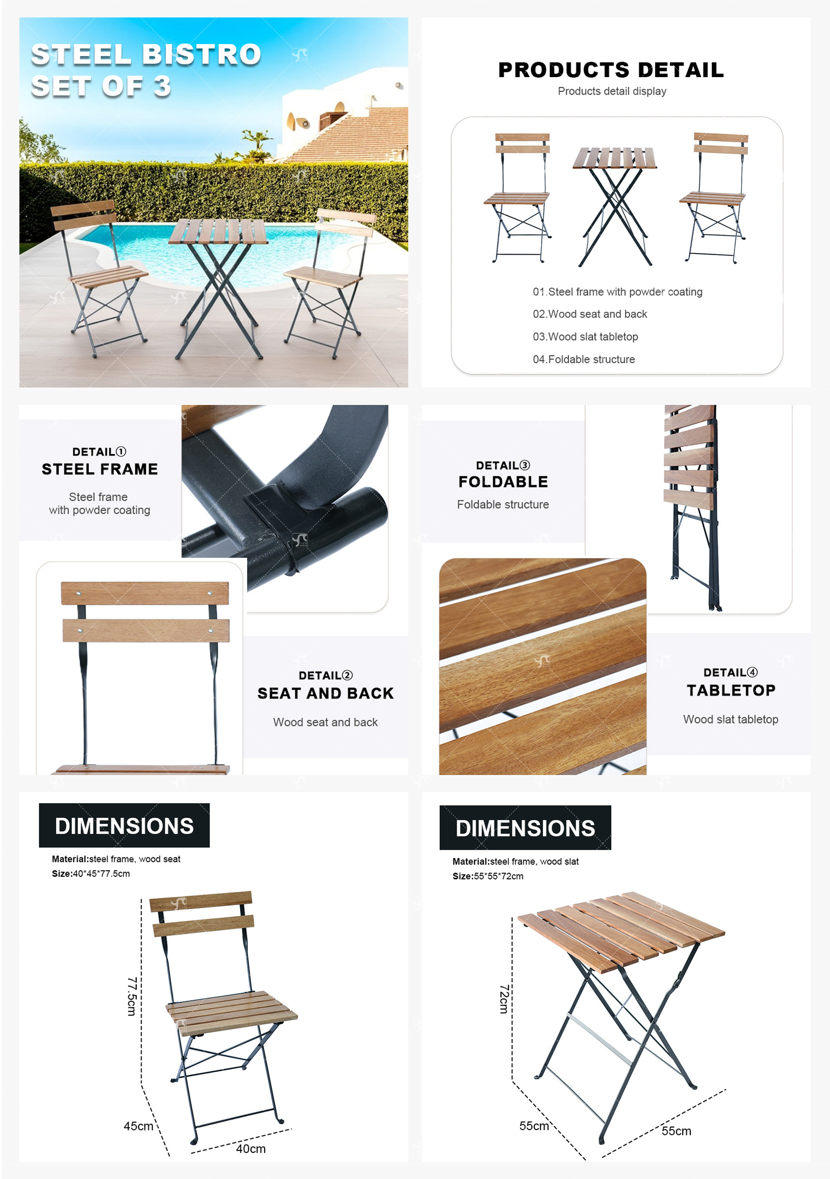 Outdoor Coffee Sets Foldable Wood Slat Table and Foldable Chair Camping Patio Dinning Steel Garden Chair Three-piece Sets