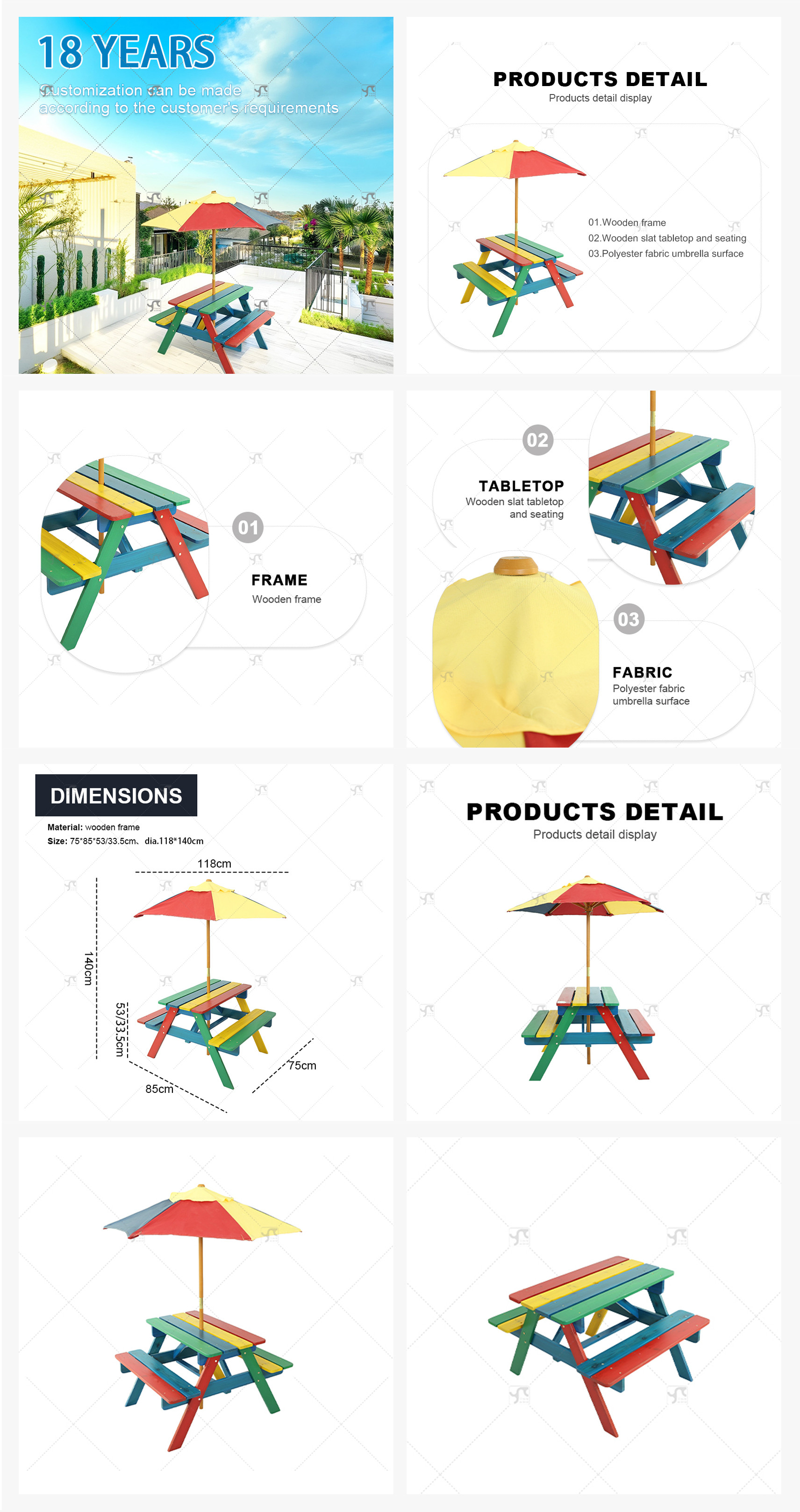 Children's Picnic Table Fir Wood Children's Table and Chair Set with Detachable Umbrella Suitable for Backyard Garden Terrace
