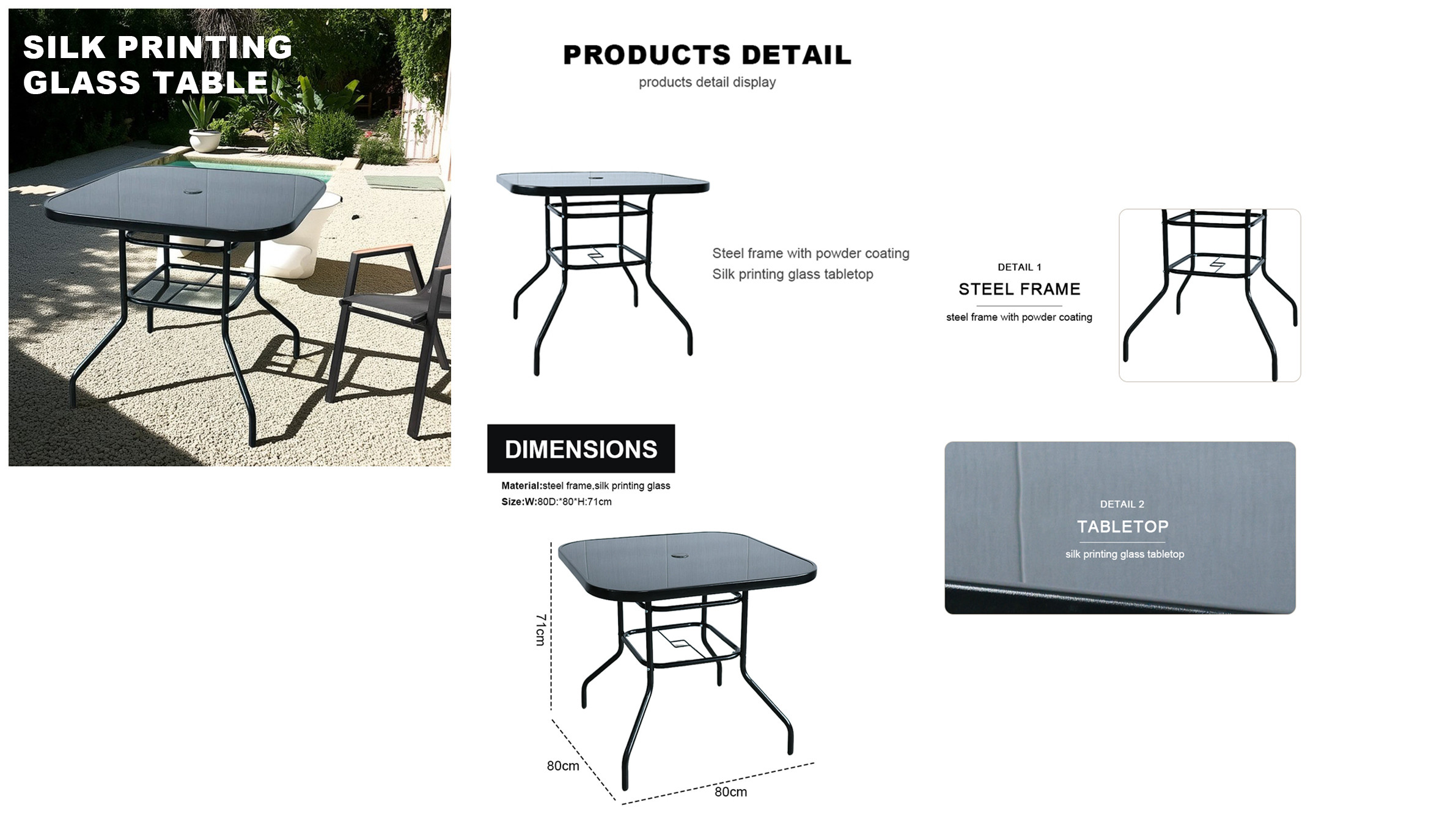 Outdoor Patio Side Square Table Garden Table with Silk Printing Glass Metal Steel Iron Dining Outdoor Table
