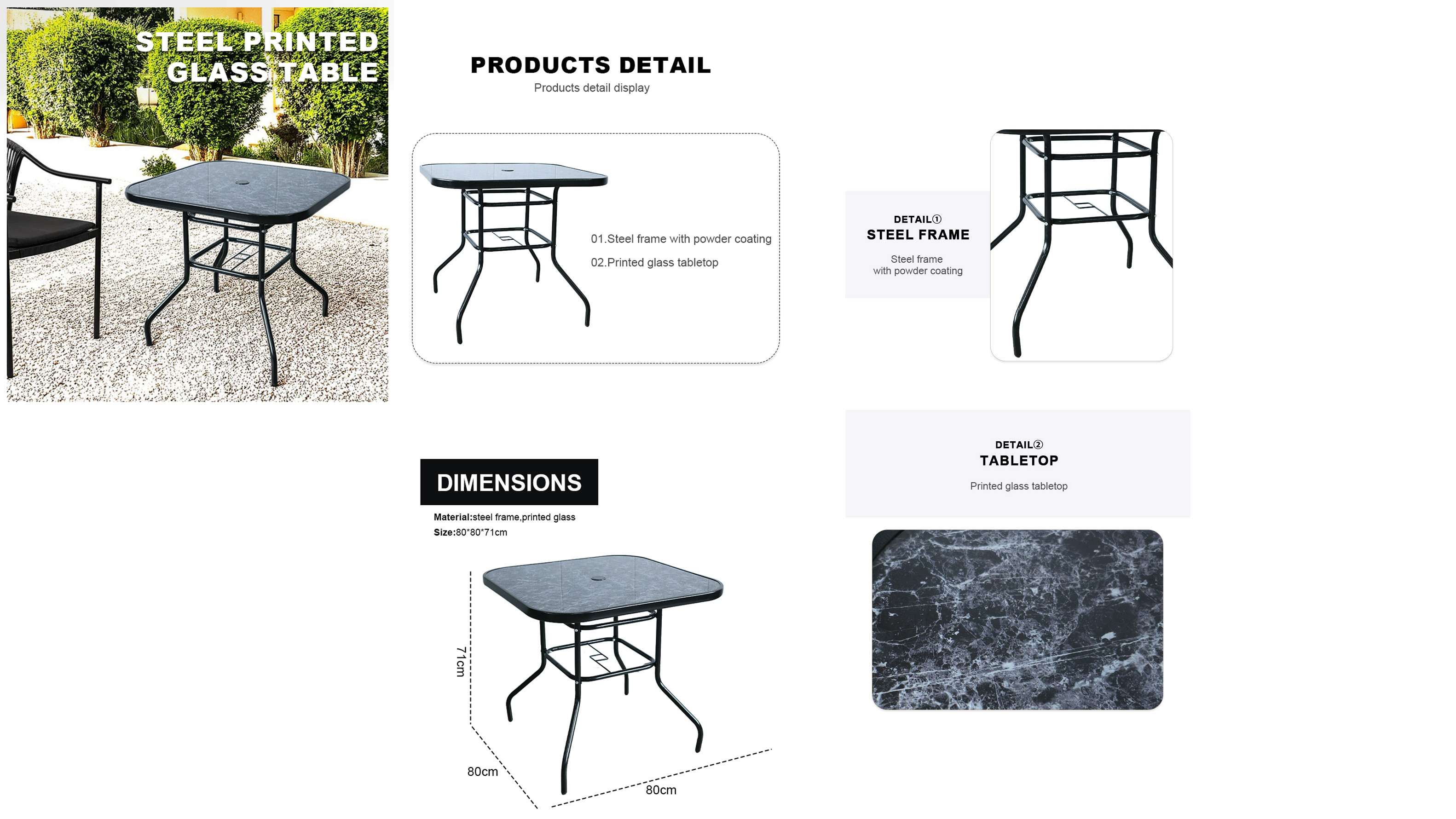 Outdoor Patio Side Square Table Garden Table with Printed Glass Metal Steel Iron Dining Outdoor Table