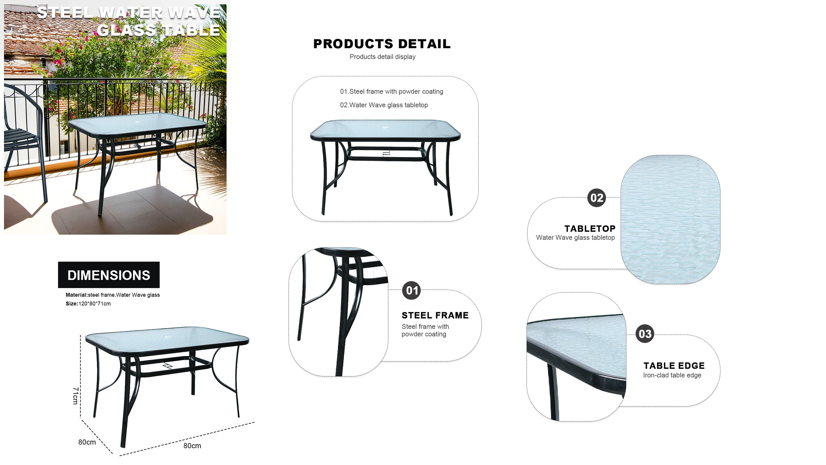 Hot Sale Outdoor Patio Side Square Table Garden Table with Water Wave Glass Metal Steel Iron Dining Outdoor Table