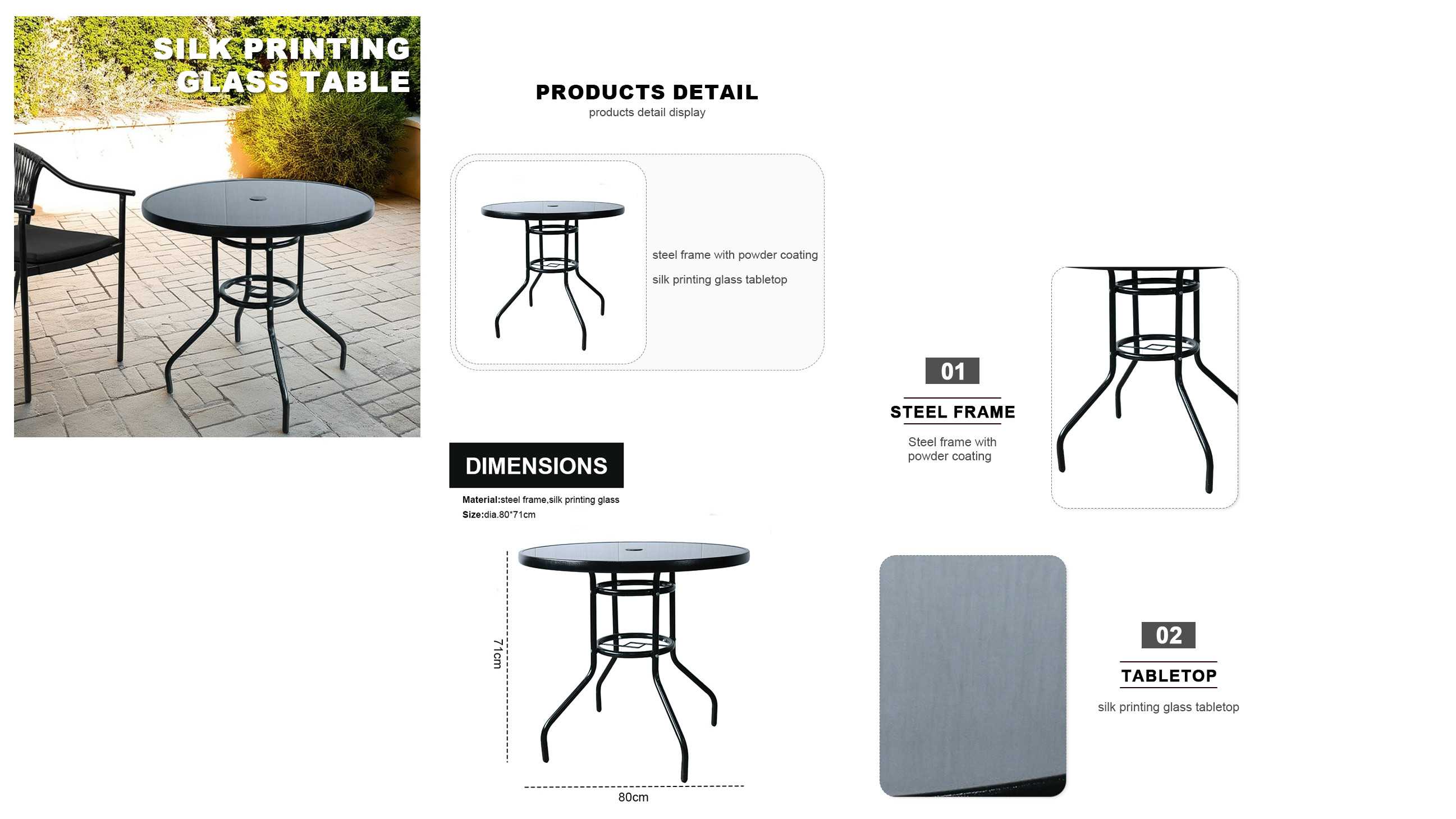 Outdoor Patio Side Table Garden Round Table with Silk Printing Glass Metal Steel Iron Dining Outdoor Table for Garden