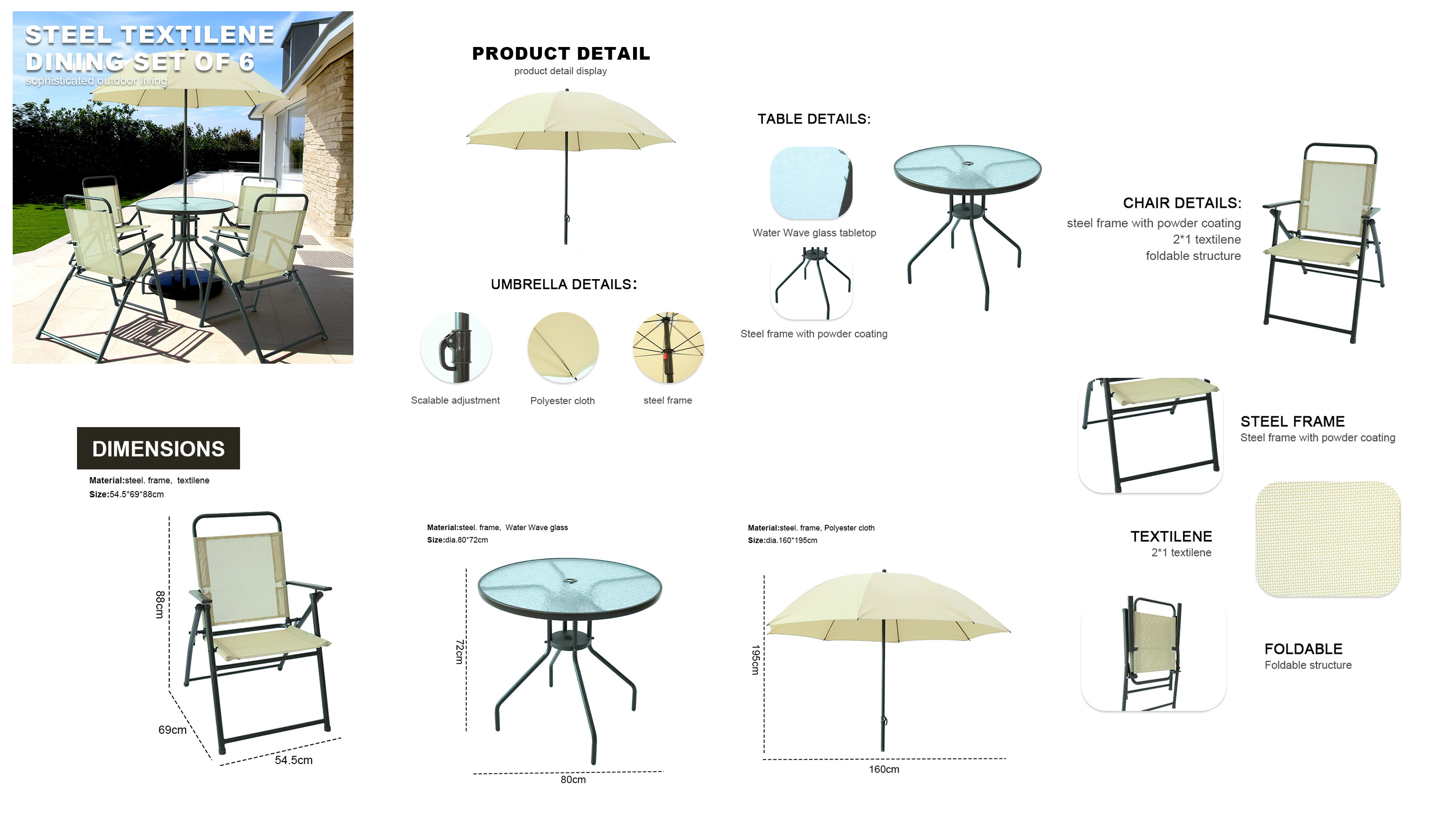 2x1 Teslin Six Piece Patio Garden Furniture Set With Umbrella Table and Set of Four Chairs with Foldable Structure