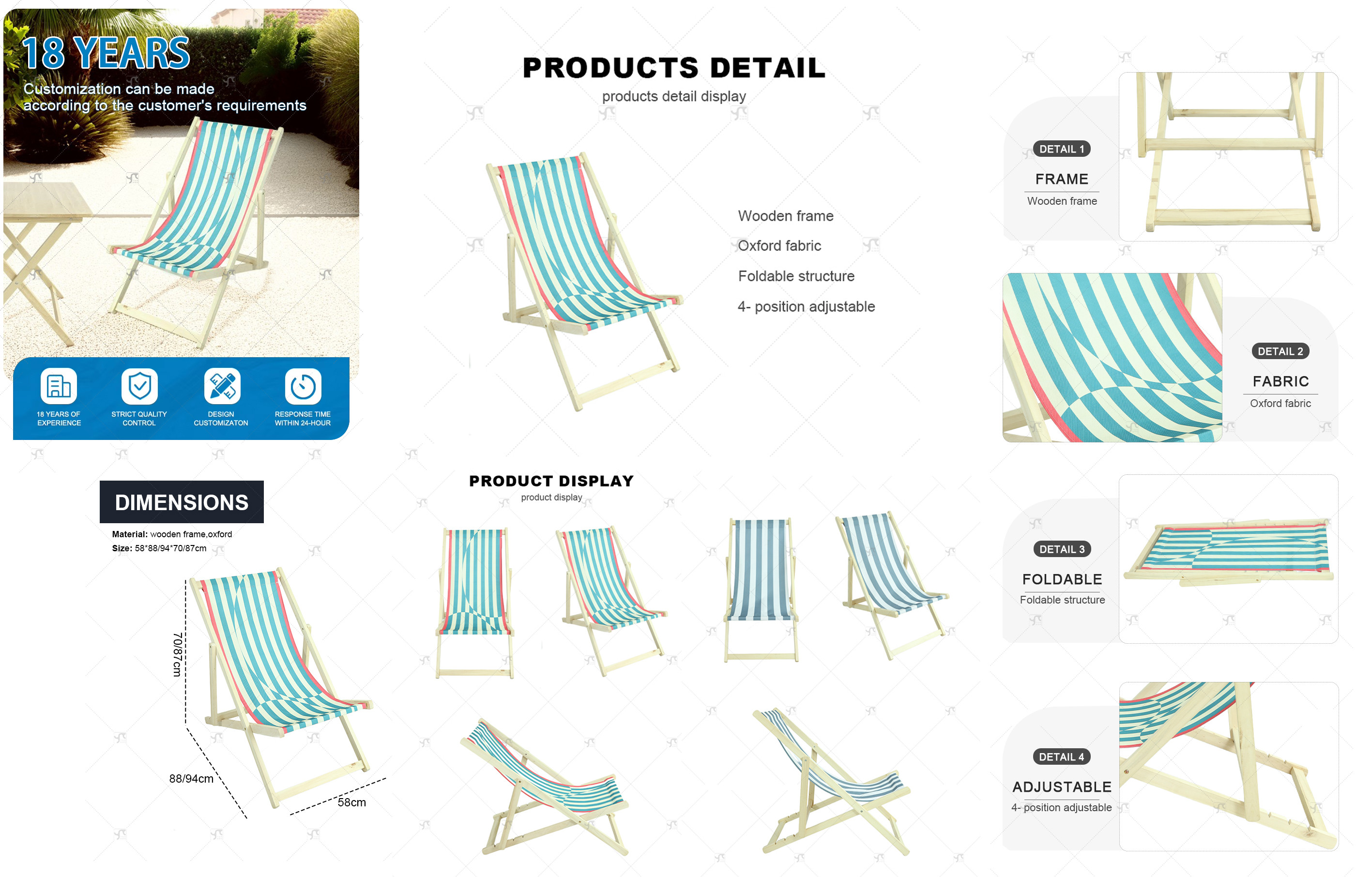 Outdoor Garden Lawn Yard Pool Party Chair with Headrest Portable Pine Wood Folding Beach Chair with Adjustable Backrest Angle