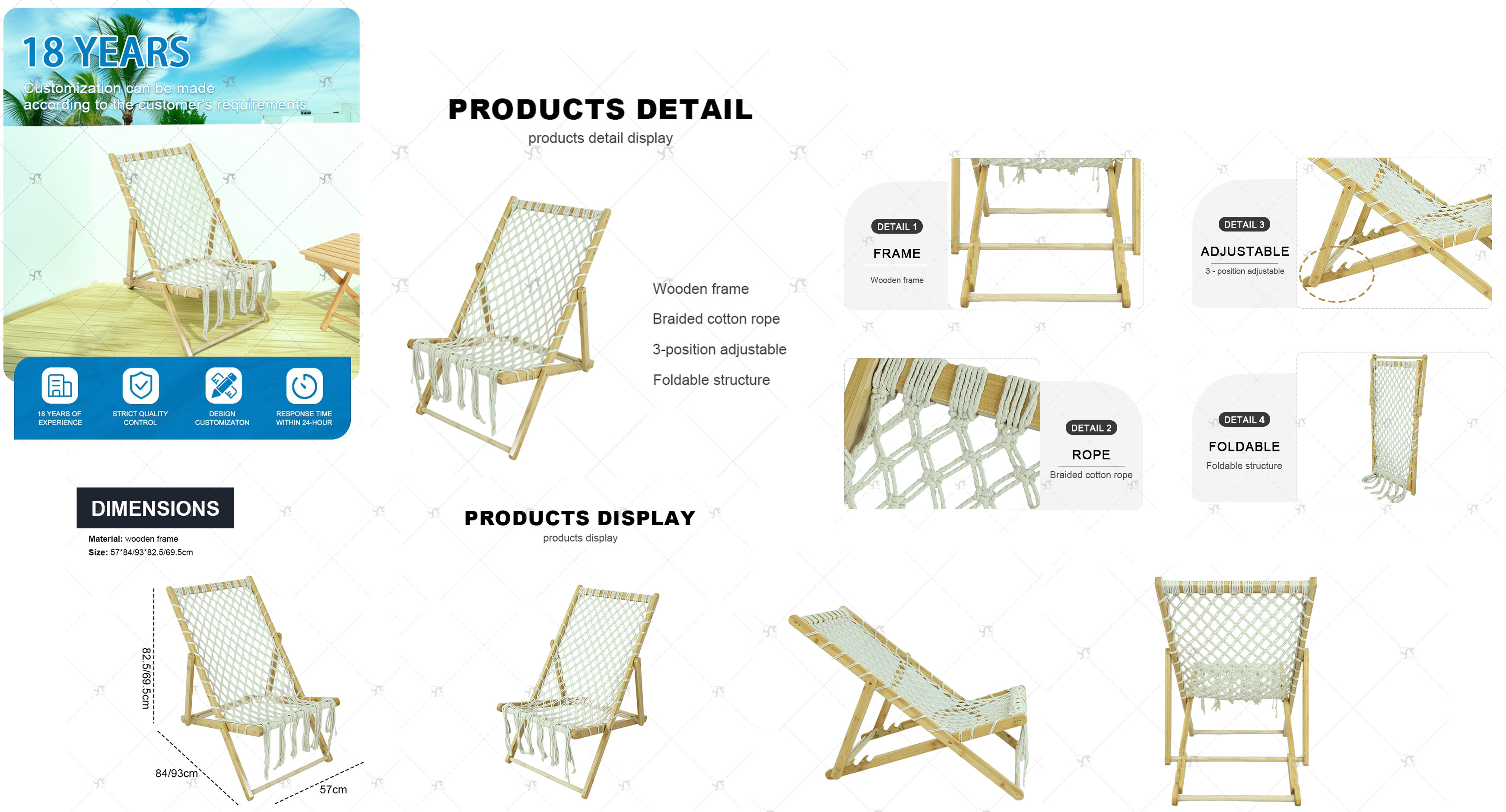 Modern Design Handwoven Rope Wooden Beach Chair - Eco-Friendly Foldable Outdoor Lounge Chair for Poolside, Garden, and Patio