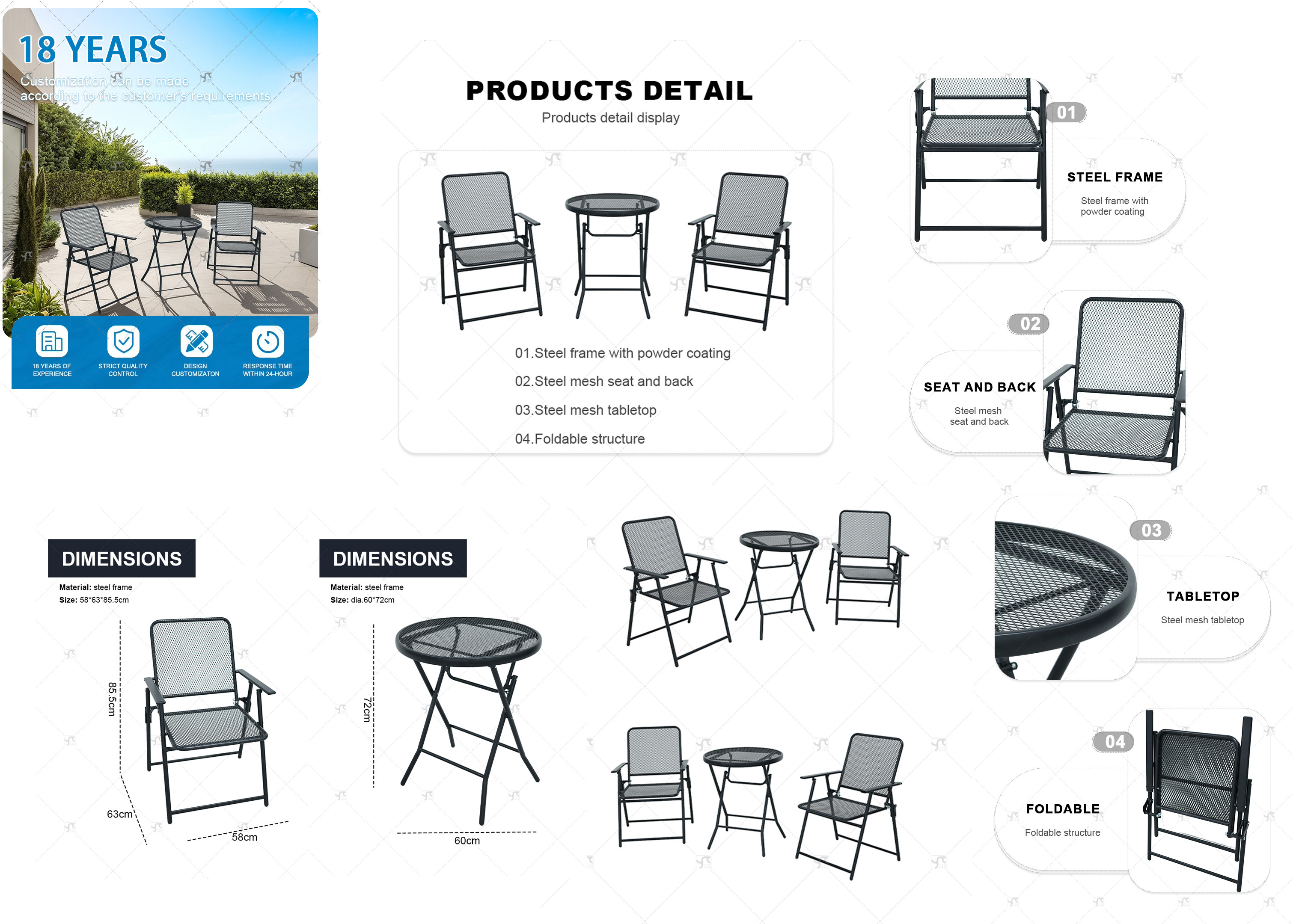 Folding Outdoor Patio Bistro Sets of 3 Stackable Portable for Deck, Garden, Camping and Travel Metal Mesh Powder Coated Lron Net